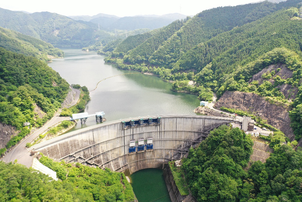 矢作ダムは、愛知県豊田市と岐阜県恵那市にまたがるアーチ式コンクリートダムで、洪水調節、不特定利水、かんがい、上水道供給、工業用水道供給、水力発電を目的とする多目的ダムです。今年で完成54年を迎えます。