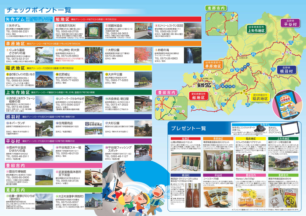・チェックポイント:矢作ダム水源地域内の観光スポット等、計24箇所に設置(詳細はリーフレット参照)