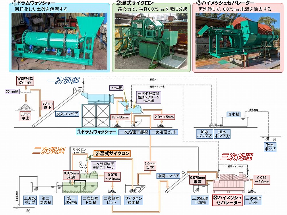 土砂研では平成29年から港湾土木で培った技術を応用した土砂分級技術の開発を開始しました。令和元年から現地実験を実施し、目標とする分級精度や有機物の除去効果が確認されており、土砂分級技術の有用性が確認できています。