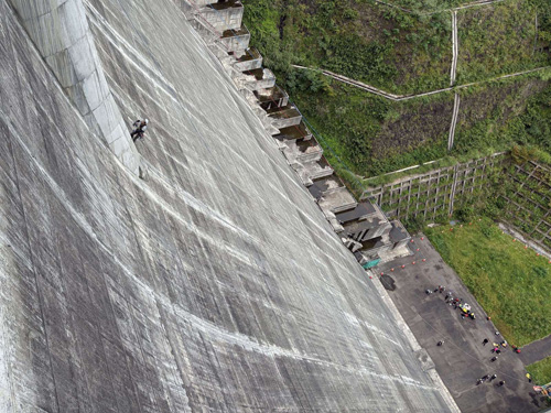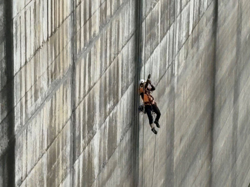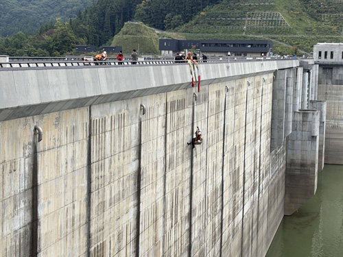 当日は100名以上の参加者が集まり、各チームに分かれて訓練に取り組んでいました。ダム堤体にロープを設置し、ダムの急斜面を登り降りする訓練や、要救助者役の方を安全に救出する訓練など、迫力ある実践的な内容が展開されていました。