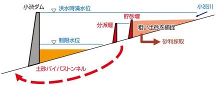 SBT(sediment bypass tunnel)は、土砂バイパストンネル(または排砂バイパス)と呼ばれているダム堆砂対策の一つです。貯水池からダム下流へ抜けるトンネルを設置して、貯水池へ流入してきた土砂を排出します。