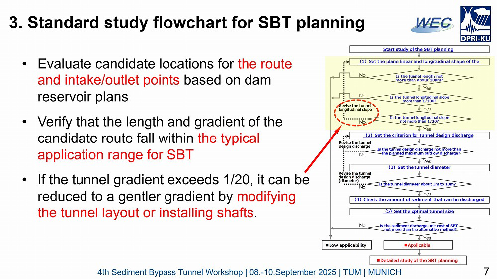 小野部長からは、2023年にWECから公表した「ダム土砂バイパストンネル計画策定のための参考手引き(案)」で提案しているSBT導入の適用性検討フローについて、検討の要点などを報告しました。質疑応答は以下のとおりでした。