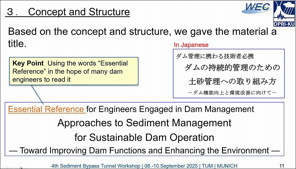 参加者は約50名で、スイス、ドイツ、コロンビア、台湾、日本などからの参加でした。日本からは京都大学防災研究所、土木研究所、ダム堆砂対策に積極的に取り組んでいる電力会社、WECなどから参加しました。