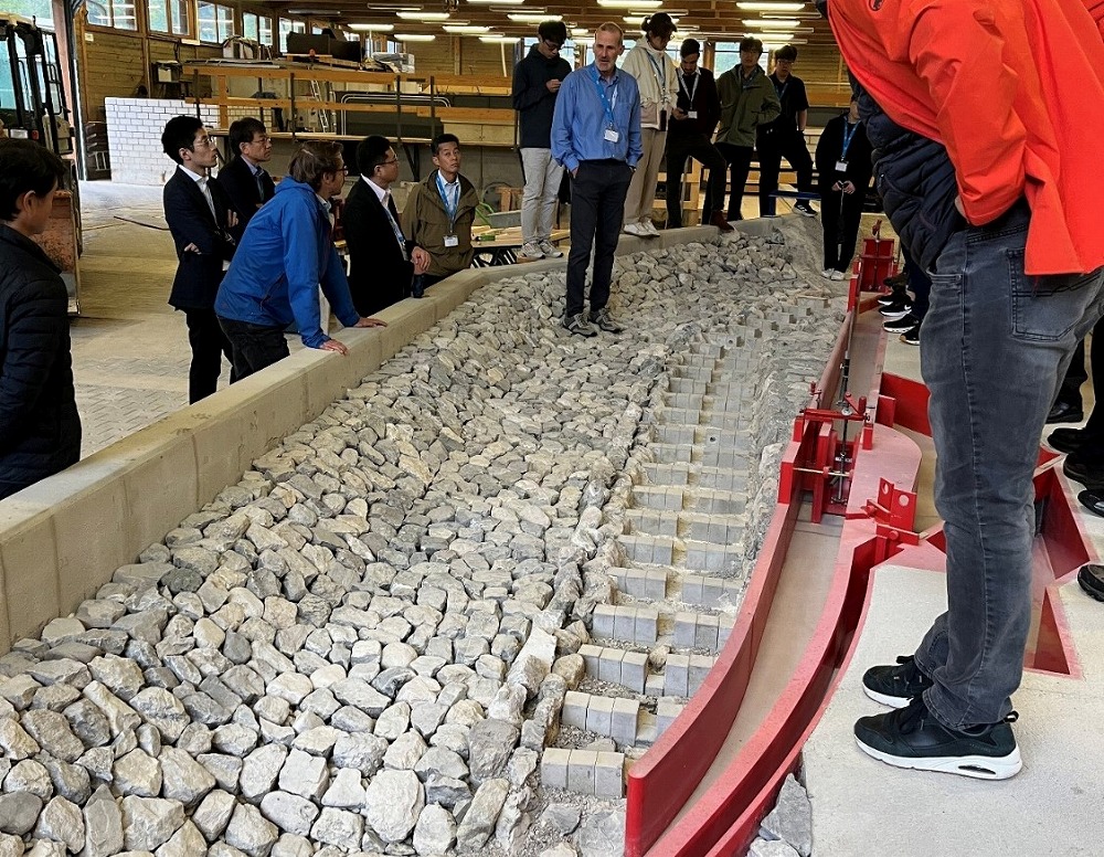 3日目に研究発表などを行ったミュンヘン工科大学オーバーナッハ研究ステーションでは、研究発表などと合わせて水理実験施設を見学しました。取水施設と魚道の模型、堰下流の洗掘実験などを見ることができました。