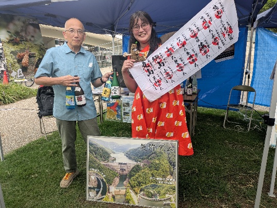 ダムブースでは、国土交通省 中部地方整備局 矢作ダム管理所の川村所長がダムと人、地域を繋ぐお酒の効果について語ってくれました。関連グッズと一緒に筆者との記念撮影に納まりました。