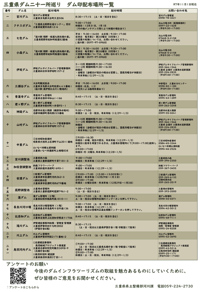 三重県では、令和7年11月1日より三重県内の21のダムで「ダム印」の配布を開始しました。このイベントは、県内にある様々なダムの役割を広く知っていただくとともに、地域の観光振興を図ることを目的としています。三重県、国、水資源機構、志摩市、中部電力株式会社、電源開発株式会社と連携して、それぞれが管理するダムの「ダム印」を配布しています。