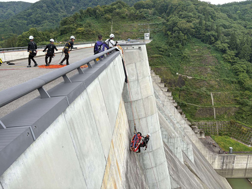 当日は100名以上の参加者が集まり、各チームに分かれて訓練に取り組んでいました。ダム堤体にロープを設置し、ダムの急斜面を登り降りする訓練や、要救助者役の方を安全に救出する訓練など、迫力ある実践的な内容が展開されていました。