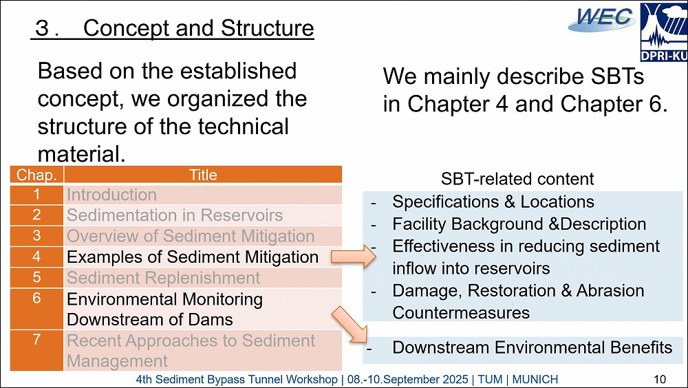 参加者は約50名で、スイス、ドイツ、コロンビア、台湾、日本などからの参加でした。日本からは京都大学防災研究所、土木研究所、ダム堆砂対策に積極的に取り組んでいる電力会社、WECなどから参加しました。