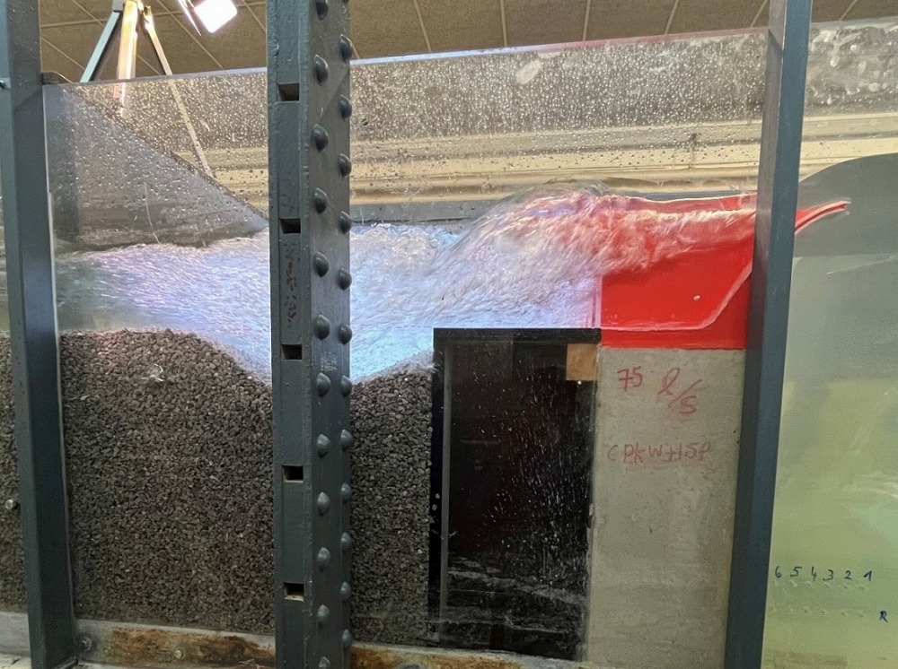 3日目に研究発表などを行ったミュンヘン工科大学オーバーナッハ研究ステーションでは、研究発表などと合わせて水理実験施設を見学しました。取水施設と魚道の模型、堰下流の洗掘実験などを見ることができました。
