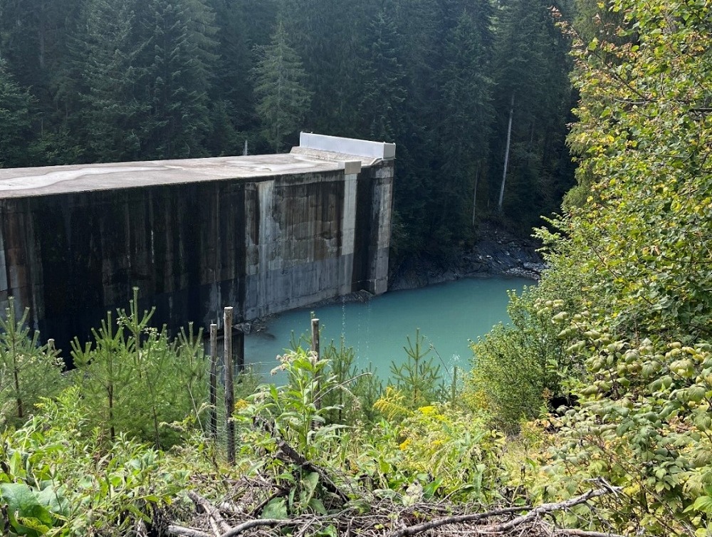 もう1箇所は、アルプス最大のアレッチ氷河の下流にあるGebidemダム(ゲビデム)です。このダムには氷河による洗掘由来の多量の土砂が流入しており、年に1回、排砂を行っています。今回は休日に訪問したため特に管理者による案内などはありませんでしたが、排砂用底部放流管と、流入河川(氷河)を見学しました。