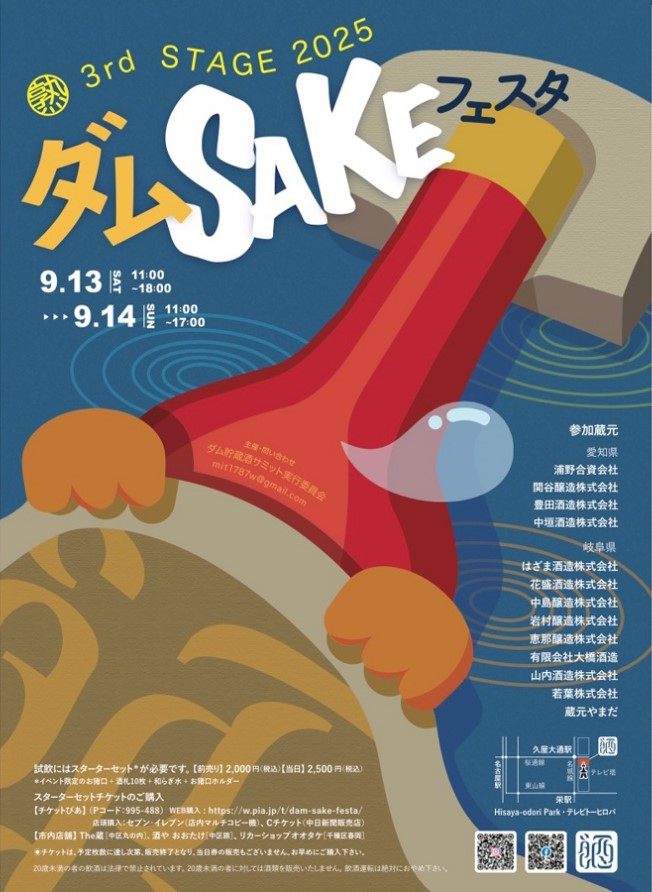 本イベントは、令和5年5月の初開催から数え今回で3回目の開催です。愛知・岐阜の13酒蔵が、地元4つのダム(矢作ダム・丸山ダム・阿木川ダム・小里川ダム)で寝かせた日本酒を提供。今年は、0年、1年熟成、2年熟成とダムで寝かせた熟成違いのお酒の飲み比べが実現。参加者にはスターターセットとしてイベント限定お猪口とお猪口を入れるおしゃれなグッズなどがもらえました。