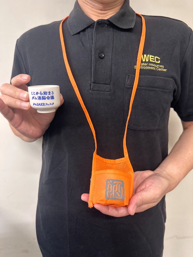 ダムブースでは、国土交通省 中部地方整備局 矢作ダム管理所の川村所長がダムと人、地域を繋ぐお酒の効果について語ってくれました。関連グッズと一緒に筆者との記念撮影に納まりました。