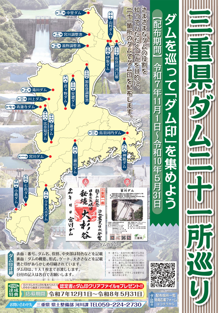 三重県では、令和7年11月1日より三重県内の21のダムで「ダム印」の配布を開始しました。このイベントは、県内にある様々なダムの役割を広く知っていただくとともに、地域の観光振興を図ることを目的としています。三重県、国、水資源機構、志摩市、中部電力株式会社、電源開発株式会社と連携して、それぞれが管理するダムの「ダム印」を配布しています。