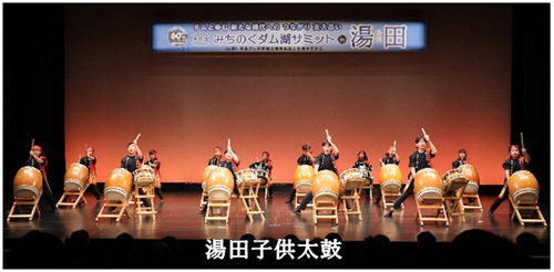 10月16日(木)の10時から湯田ダム60周年記念式典がサミットと同会場で実施しました。オープニングアトラクションは地元の小学生とその保護者で構成されている「湯田みかぐら」の皆さんによる演舞が披露されました。