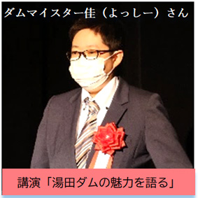 その後は主催者あいさつ、来賓あいさつ、湯田ダム60年の歩みに続き、これまでに全国800基以上を訪れたダムマイスターのよっしーさんより「湯田ダムの魅力を語る」と題した講演が行われました。講演の中で「湯田ダムは推しダムの中でトップ3に入るお気に入りであること」、「過去には放流イベントに参加するため飛行機に飛び乗って日帰り湯田ダムを実行したこと」等を熱く語っていただきました。