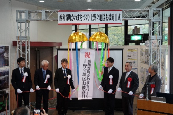 10月16日(木)の午後からは「西和賀町かわまちづくり計画」として整備した上野々地区の護岸整備が完了したことからお披露目式を開催しました。式典は、主催者あいさつ、来賓あいさつ、事業概要説明に続き、西和賀町集落支援員の高橋若菜さんより期待の言葉をいただきました。最後に出席者によるくす玉開披を行い、式典は終了しました。